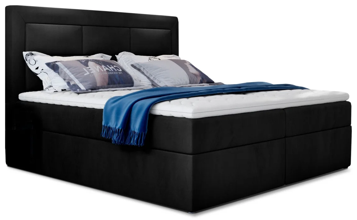 Boxspring KORBELA o rozměrech 140×200 cm je moderní postel, která má topper v ceně a praktický úložný prostor. Lůžko je potaženo černou látkou Mat Velvet 99, která působí elegantně a snadno se čistí.
