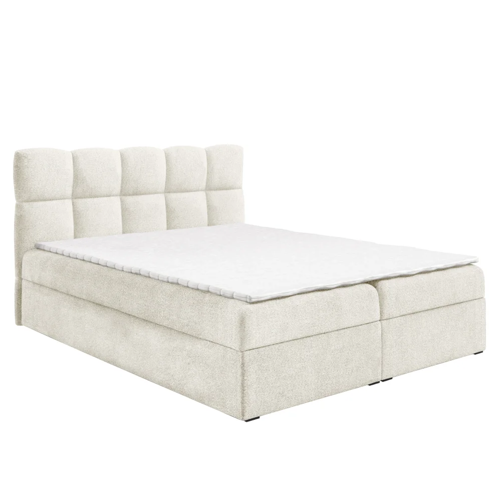 Boxspringová postel NEGRY v elegantní smetanové barvě nabízí komfortní spaní a praktické úložné řešení. Látka Coral Bouclé a laminovaná DTD/MDF deska zajišťují pevný a stylový rám.