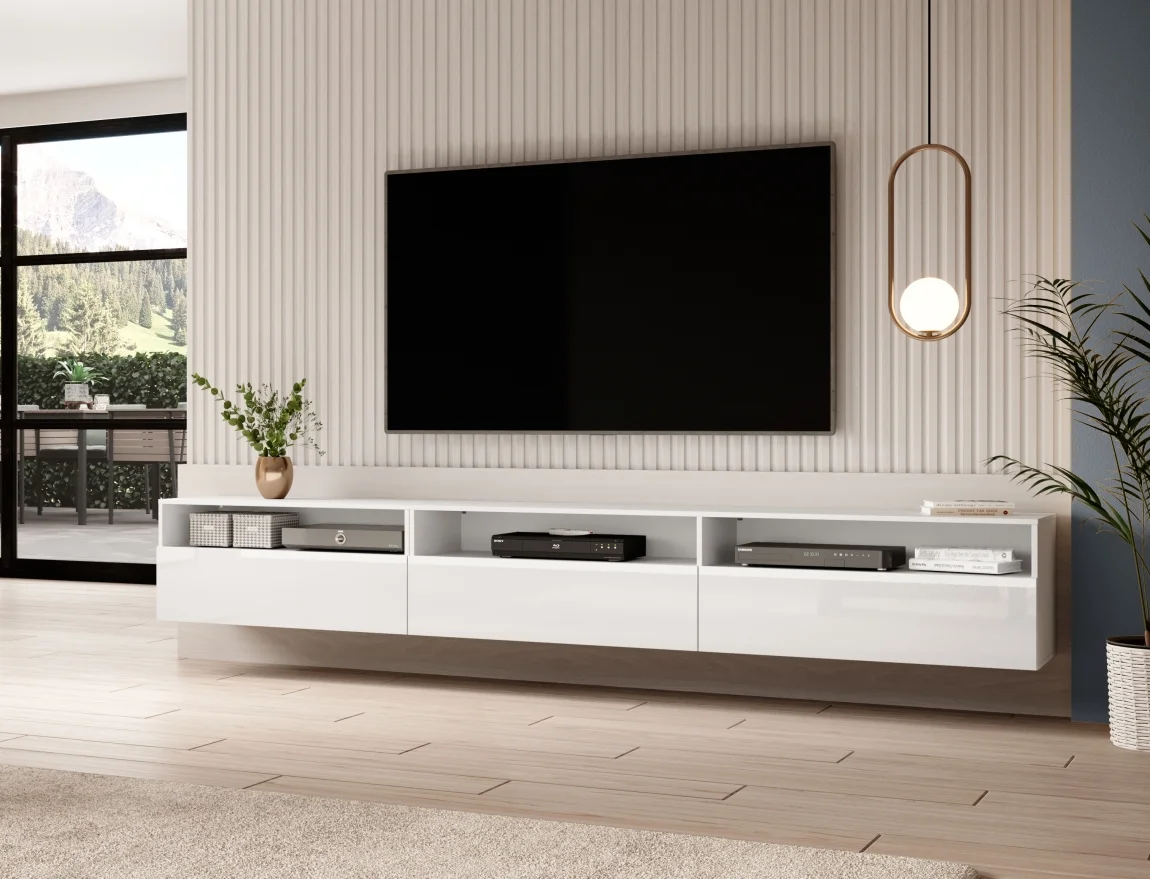 Televizní stolek BRODIE v provedení bílé s vysokým leskem se hodí do moderního obývacího prostoru. Lze ho pohodlně zavěsit na zeď nebo postavit na podlahu podle toho, jaké uspořádání prostoru preferujete.