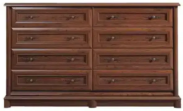 Prostorná komoda ze systému KENT nabízí pohodlný úložný prostor a disponuje osm zásuvek, které usnadní přehledné uspořádání věcí. Design zdobí bohatě vyřezávané lišty, sokly a dvířka spolu s jemnými kovovými úchyty, čímž vzniká rustikální vzhled s nádechem historie. Materiál kombinuje lamino potažené folií a MDF lišty, což zajišťuje pevnost, odolnost a snadnou údržbu. Komoda je dodávaná v demontu, s návodem pro rychlou montáž. K dispozici je v dvou barevných provedeních: kaštan a dub Amsterdam. Tento kus je vhodný do obývacího pokoje i ložnice a díky nadčasovému stylu se hodí k různým zařízením interiéru; poskytuje praktické řešení pro ukládání věcí a zároveň vizuálně doplňuje prostor.