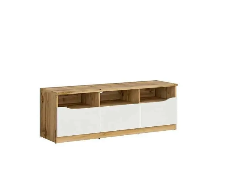 Televizní stolek Nuis RTV3S od BRW kombinuje světlý bílý lesk s teplým odstínem dubu wotan a vytváří v obývacím pokoji příjemný moderní vzhled. Konstrukce je vyrobená z lamina a MDF, což zajišťuje pevnost a dlouhou životnost. Dodáváno v demontu a montáž je díky přiloženému návodu rychlá a jednoduchá. Dvířka a čela šuplíků v bílé lesklé úpravě spolu s dřevěnými prvky vytvářejí jemný kontrast a čistý, stylový vzhled. Zajímavý detail představují úchyty spojené s horním lemem předních ploch, které působí nenápadně a elegantně. Tento stolek je ideální volba pro moderní interiéry, jednoduše se sladí s dalším nábytkem a poskytuje dostatek místa pro televizi i příslušenství.