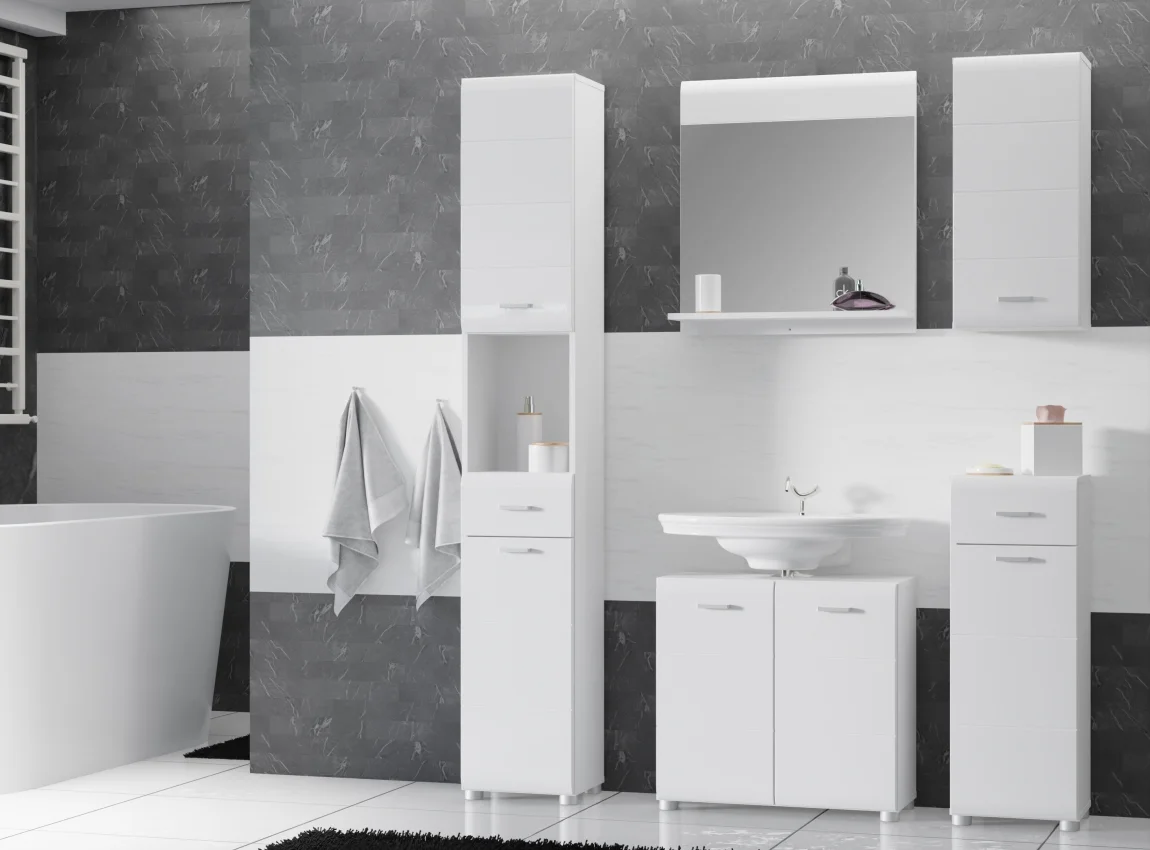 Materiál: lamino/MDF; úchyty kovové; zrcadlo součástí. Barva: korpus bílá, dvířka: bílý lesk. Sestava se dodává bez umyvadla a v demontu. Modulární systém umožňuje snadné rozšíření či úpravy konkrétních rozměrů podle vaší koupelny a designu. Díky kvalitním materiálům je údržba jednoduchá a odolná, což zajišťuje dlouhodobou spokojenost. Navíc lze díly dokoupit samostatně, takže sestavu můžete kdykoli rozšířit podle potřeby.