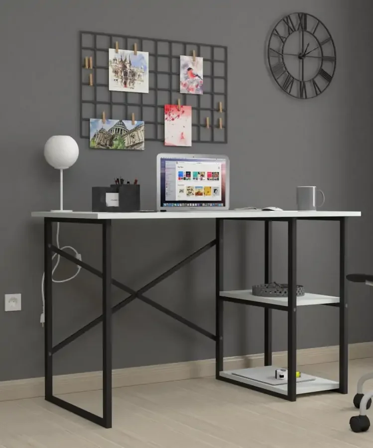 IRVING je stylový psací stůl se dvěma policemi, který kombinuje robustní kovový rám v matné černé a pracovní desku z kvalitní LTD desky v matném bílém provedení. Díky modernímu loftovému pojetí se hodí do klasických i současných interiérů pracoven, dětských či studentských pokojů a také do kancelářských prostor. Dodáváme v demontovaném stavu. Praktické úložné řešení se dvěma policemi usnadní organizaci dokumentů a pomáhá udržet pořádek na pracovním koutě. Snadná montáž a pevná konstrukce zajišťují dlouhodobou stabilitu, díky čemu je tento stůl skvělou volbou pro domácí i profesionální využití.