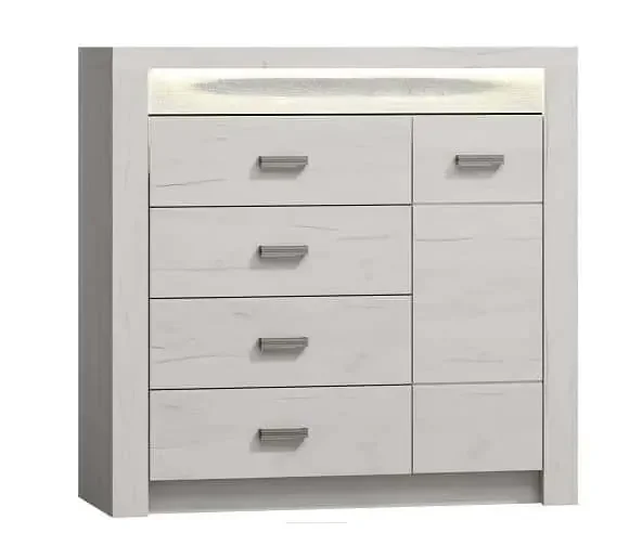 Komoda ze sektorové řady INDIANAPOLIS spojuje čisté linie a praktické členění úložného prostoru. Na levé straně najdete 4 zásuvky, na pravé pak skříňku s dvěma policemi. Celá řada se vyznačuje moderním designem a díky kvalitní laminované úpravě povrchu odolává každodennímu provozu. Pokud ji doplníte LED osvětlením do ozdobné rýhované lišty (dostupné v naší nabídce), získáte jemné podsvětlení, které zdůrazní rustikální vzhled připomínající masivní dřevo. Díky svým jednoduchým tvarům a promyšlenému uspořádání poskytuje dostatek místa a zároveň šetří prostor. Dodáváme v demontovaném stavu pro pohodlnou dopravu a montáž.