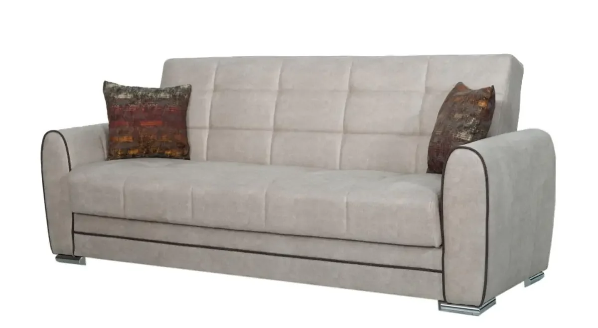 Casarredo LAPALIO je třímístná rozkládací pohovka s praktickým úložným prostorem, který skvěle doplní každý interiér. Příjemný komfort zajišťují Bonnellovy pružiny a vysoce kvalitní PUR pěna, jež umožňují pohodlné sezení i spaní pro vás i vaše hosty. Pod sedákem se nachází prostorný úložný prostor, kam uložíte ložní prádlo či přikrývky. Potah v elegantní světlé béžové barvě s tmavým lemem a dekorativními polštářky doplňuje chromové nožičky, čímž vzniká nadčasový vzhled. Pokud hledáte pohodlný nábytek pro každodenní odpočinek i občasné spaní, LAPALIO je ideální volba; lze k němu dokoupit i samostatné křeslo. Spací plocha po rozložení činí 115 x 182 cm a celkové rozměry jsou 221 x 83 x 91 cm.