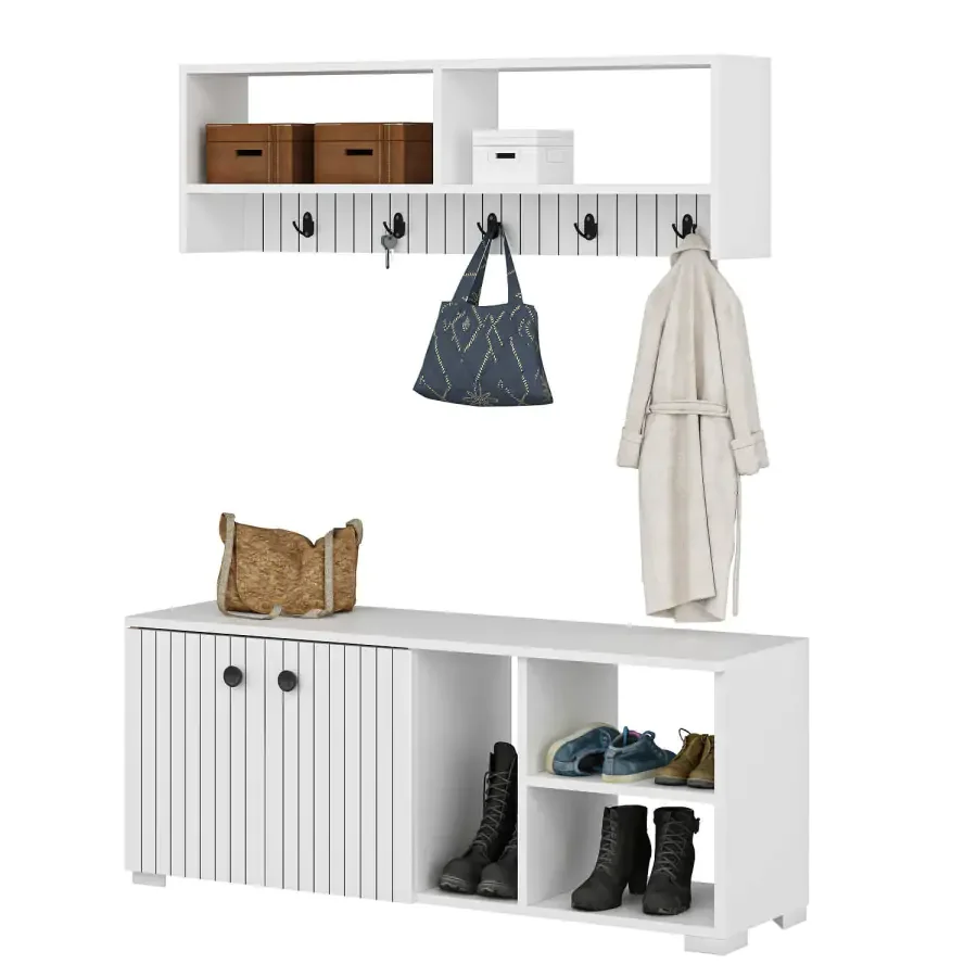 Casarredo NULATO představuje stylové a praktické řešení pro vaši předsíň. Rozměry 51,6 x 120 x 31,4 cm zajišťují vhodnost i do menších prostor. Vyrobena je z kvalitní LTD desky 18 mm, která zaručuje pevnost a dlouhou životnost. Sestava obsahuje závěsný věšák a botník, doplněné plastovými úchytkami a kovovým věšákem pro snadnou organizaci oblečení a obuvi. Dodáváme v demontu; barva je bílá.