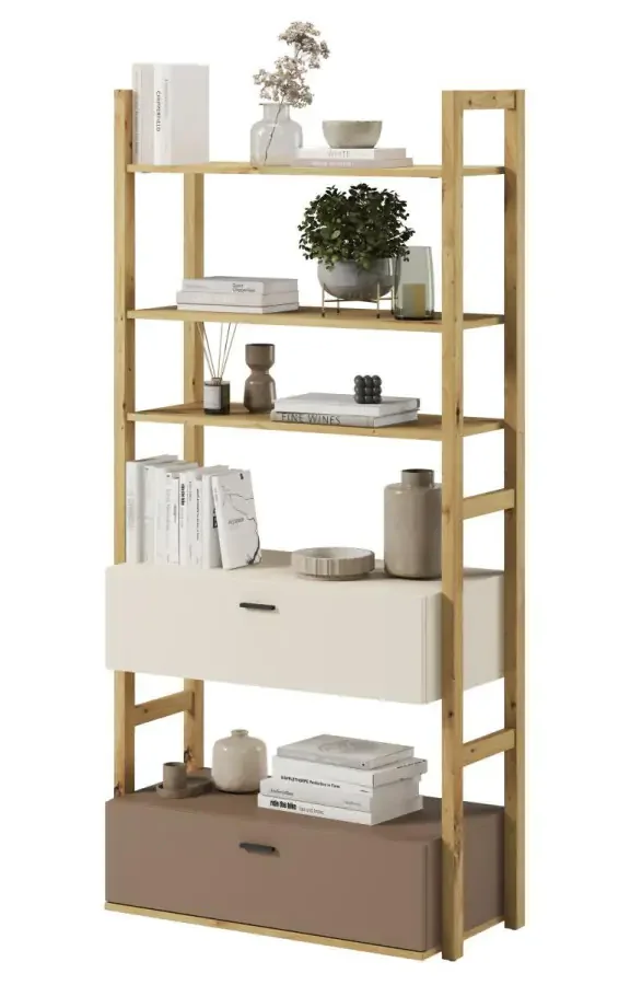 Kombinace odstínů pískově béžové, lanýžového tónu a dekoru dub artisan vytváří nadčasový a snadno kombinovatelný vzhled. Regál dodáváme v demontovaném stavu a k montáži slouží kompletní hardware; snadná montáž a stabilní konstrukce zaručují rychlé a pevné složení. Využijete ho pro organizaci knih, hraček i drobných doplňků a díky otevřenému prostoru působí minimalisticky a útulně.