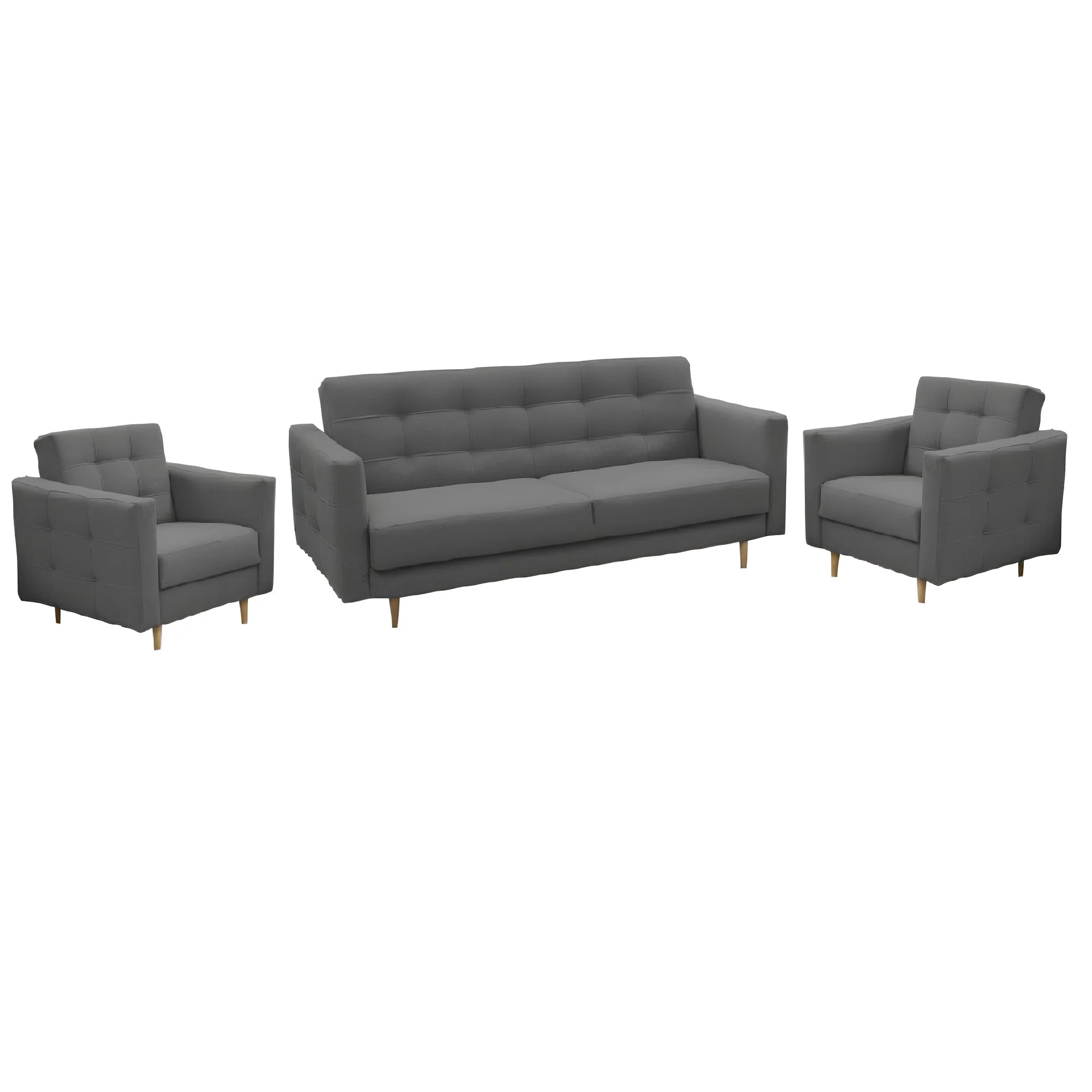 Elegantní celočalouněná souprava 3+1+1 v tmavě šedé látce představuje kombinaci pohodlí a nadčasového designu inspirovaného skandinávským stylem a značkou AMEDIA. Látka NORN je vysoce odolná, podle testu Martindale dosahuje až 50 000 oděrů, což garantuje dlouhou životnost při každodenním používání. Nohy jsou vyrobeny ze dřeva v přírodním odstínu, který ladí s tmavým čalouněním a dodává interiéru lehkost. Sestava zahrnuje třísedovou sedačku s úložným prostorem a dvě samostatná křesla; celkové rozměry jsou 207 × 94 × 92 cm, plocha na spaní 124 × 181 cm, křesla pak měří 88 × 95 × 90 cm. Hloubka sedu činí 62 cm a výška sedu 45 cm; výška spodního prostoru nad podlahou je 13 cm a výška zádové opěrky 47 cm. Ramena mají šířku 13 cm a výšku 54 cm, nosnost na osobu je 90 kg. Výbavu doplňuje dekorativní prošití a bonellová pružina v sedáku, což zajišťuje pevnost i pohodlí. Sedačka je dodávána v demontu a jednoduše se montuje, takže ji zvládne každý.