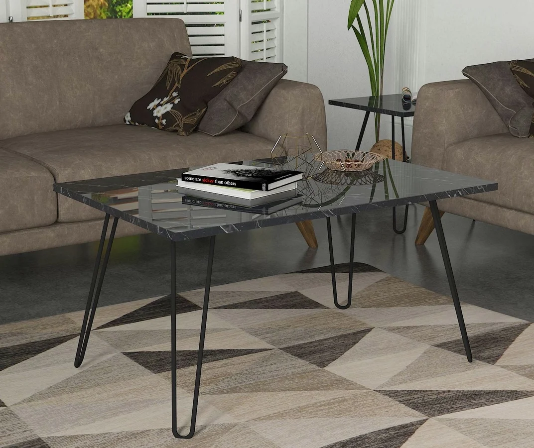 Stabilní konferenční stolek CEPA s černými kovovými nohami dodá moderní vzhled každému obývacímu pokoji. Deska z lamina tloušťky 18 mm s PVC hranou v designu mramoru černého je odolná proti poškrábání a snadno se udržuje.
