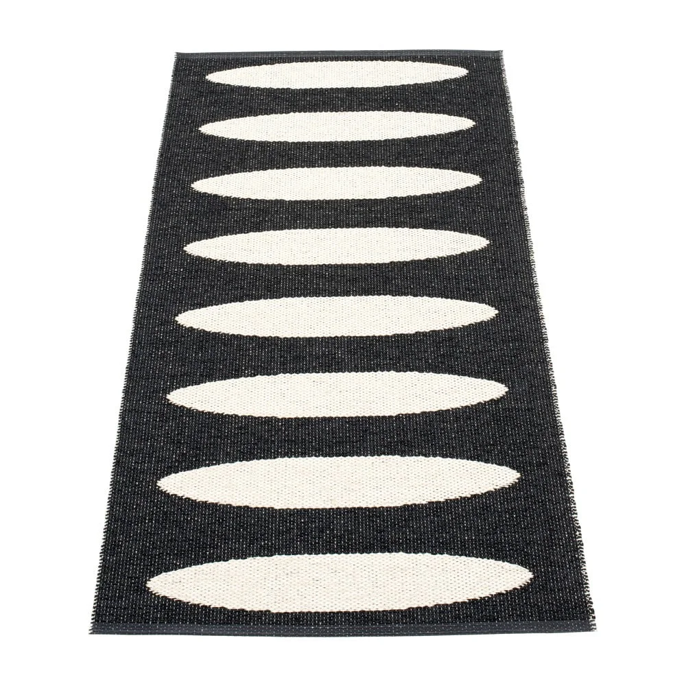 Stylový běhoun Ella Black je ideální volbou pro ty, kteří hledají elegantní a odolný doplněk do domácnosti nebo na terasu. Inspirací pro jeho design byly úspěšné vzory značky Pappelina, avšak s jemnějšími, eliptickými tvary, které dodávají produktu subtilní a moderní vzhled. Tento koberec je vyroben ze švédského PVC bez ftalátů, což zaručuje jeho bezpečnost a dlouhou životnost.