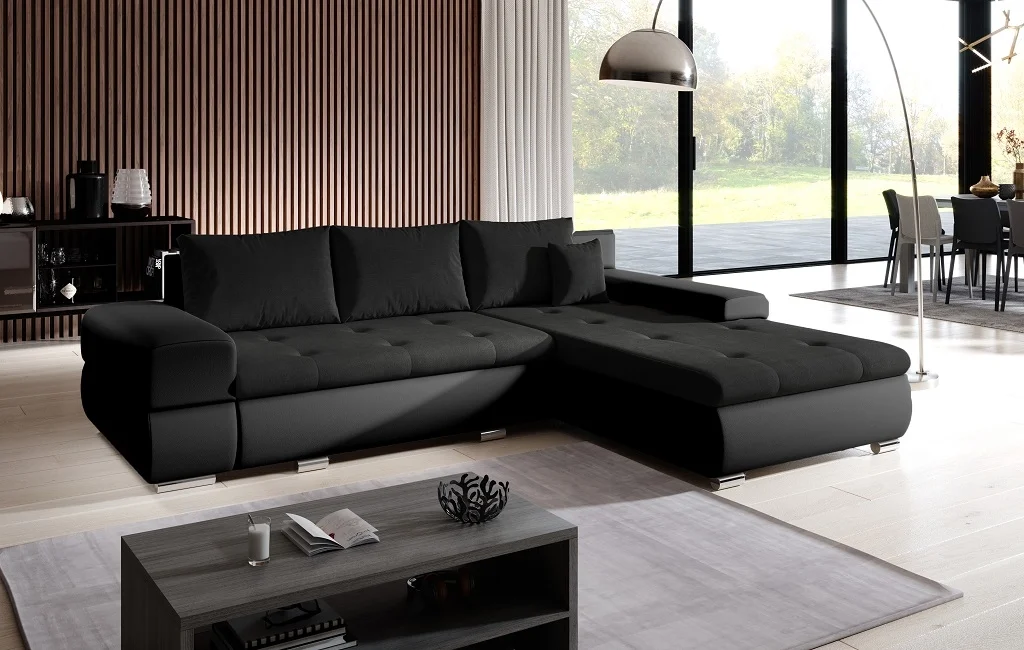 Rohová rozkládací sedačka COLORITO MINI 13 je navržena jako praktická a flexibilní: roh lze po montáži snadno nastavit pro pravý i levý směr podle prostoru. Ilustrační obrázek rozkladu ukazuje jinou barevnost; skutečné varianty potahu zahrnují Orinoco 100 v černošedé látce a madryt 1100 v černé ekokůži.