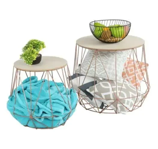 Set drátěných příručních stolků DALUX přináší originální tvar a moderní kombinaci materiálů. Deska stolku je vyrobená z MDF v přírodní barvě, zatímco podstavu tvoří kovová noha v teplém měděném odstínu, která dodává šarm a stabilitu. Výsledkem je výrazný, ale jemný doplněk do obývacího pokoje či ložnice. Dodání je v demontu pro snadnou dopravu a montáž je rychlá a bez komplikací. Rozměry: větší 50 x 50 x 40 cm, menší 40 x 40 x 35 cm. Oba stolky lze využít samostatně nebo jako soupravu pro praktické odkládací plochy při posezení.