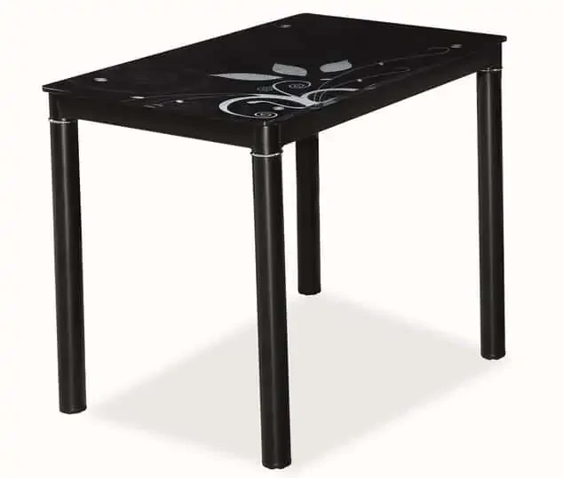 Moderní jídelní stůl spojuje styl s praktickou provedeností, díky čemu se hodí do každé moderní jídelny. Nohy stolu jsou kovové a lakované černou barvou, horní deska je z tvrzeného skla v černém odstínu s jemnými bílými kresbami.