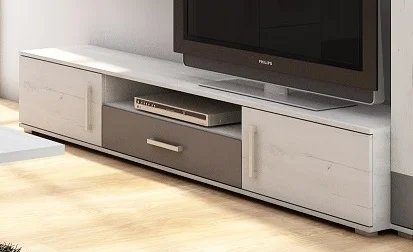 Stylový televizní stolek DAMARA kombinuje craft bílou s grafitovými prvky a nabízí moderní vzhled i dostatek místa pro vaši AV techniku. Je vyroben z laminované desky 16 mm tloušťky s ABS hranou 0,6 mm, což zajišťuje pevnost a snadnou údržbu.