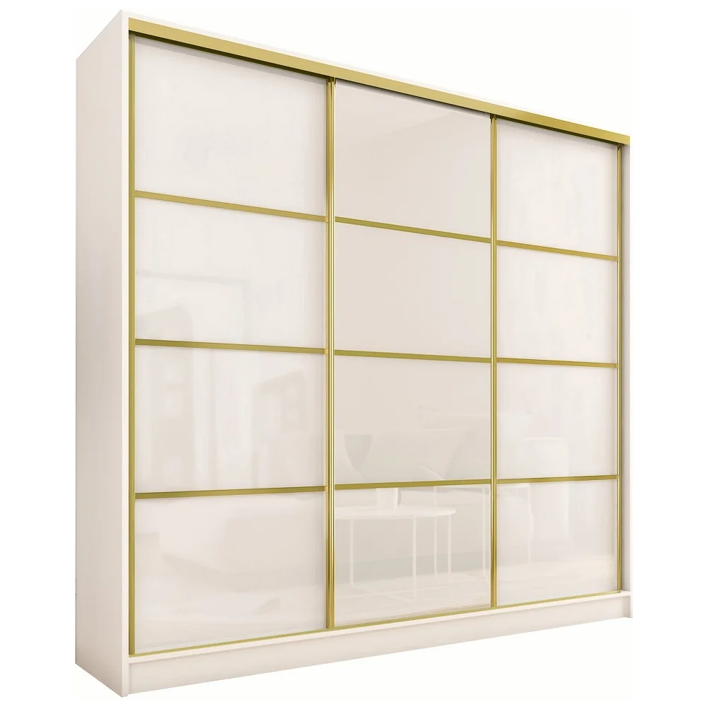 Šatní skříň s posuvnými dveřmi v lesklém bílém provedení o rozměrech 200 × 205 × 56 cm je vyrobena z lamina o tloušťce 16 mm, což zaručuje pevnost a snadnou údržbu. Uvnitř najdete 6 polic, 2 šatní tyče a 4 šuplíky, které tvoří praktický systém pro uskladnění oděvů a doplňků. Kování a ozdobné lišty v zlaté barvě dodávají skříni stylový lesk, avšak lišty na dveřích není nutné instalovat; můžete tak mít dokonale hladké dveře. Na dveřích není zabudované zrcadlo, což dává prostor na volbu čistého vzhledu. Dodáváno v demontu, montáž je snadná a rychlá.