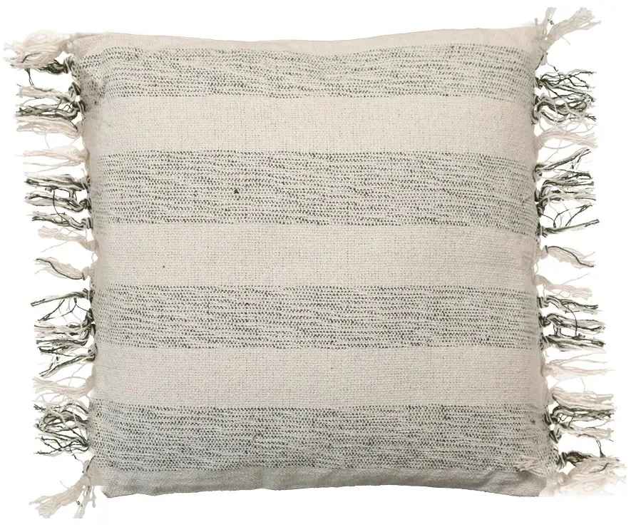 Stylový polštář s rozměry 45x45 cm, který dokonale zpestří váš interiér. Vyroben z kvalitní 100% bavlny s výraznými zelenými pruhy a ozdobnými třásněmi po stranách, přináší nejen estetický dojem, ale i pohodlí.