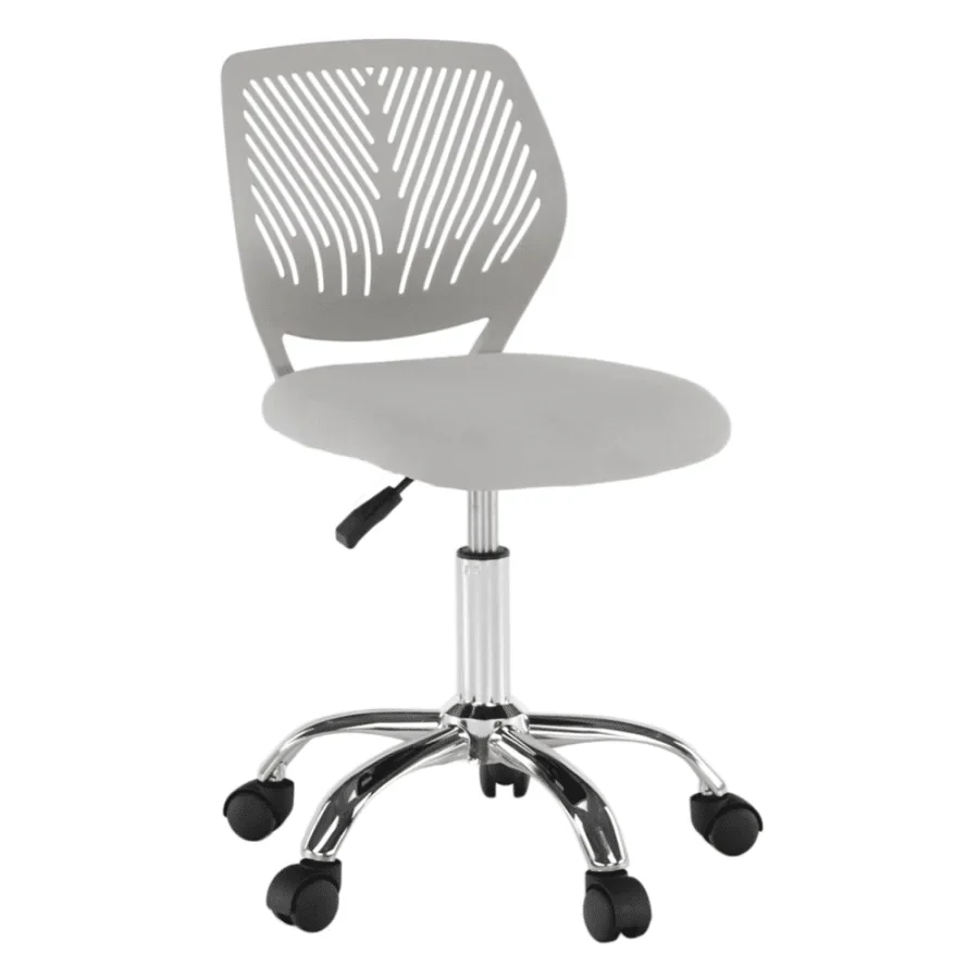 Otočná dětská židle SELVA v kombinaci šedé a chromu zaujme perforovaným opěradlem pro lepší prodyšnost. Konstrukce je vyrobená z kovu, plastu a polyesteru, což zajišťuje pevnost a dlouhou životnost.
