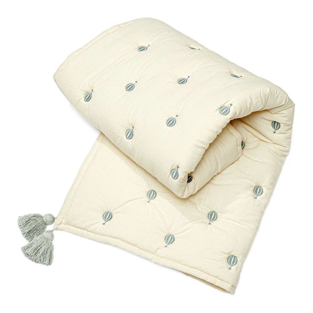 Deka Balloon od Cam Cam Copenhagen vyniká jemnou výšivkou po celé ploše a měkkou bavlněnou texturou s jemnou krepovou vazbou. Je vyrobena z bio bavlny a má lehkou seersucker vazbu, díky níž je příjemná na dotek a nadýchaná. Deka je výrazně polstrovaná a skvěle se hodí na pohodlné hraní na podlaze, jako dekorativní přehoz přes postel či pro zachumlání. Doplňují ji elegantní střapce, které podtrhují její hravý vzhled a šarm. Přináší do dětského pokoje teplou, útulnou atmosféru s nádechem vintage kouzla a bývá skvělým dárkem.