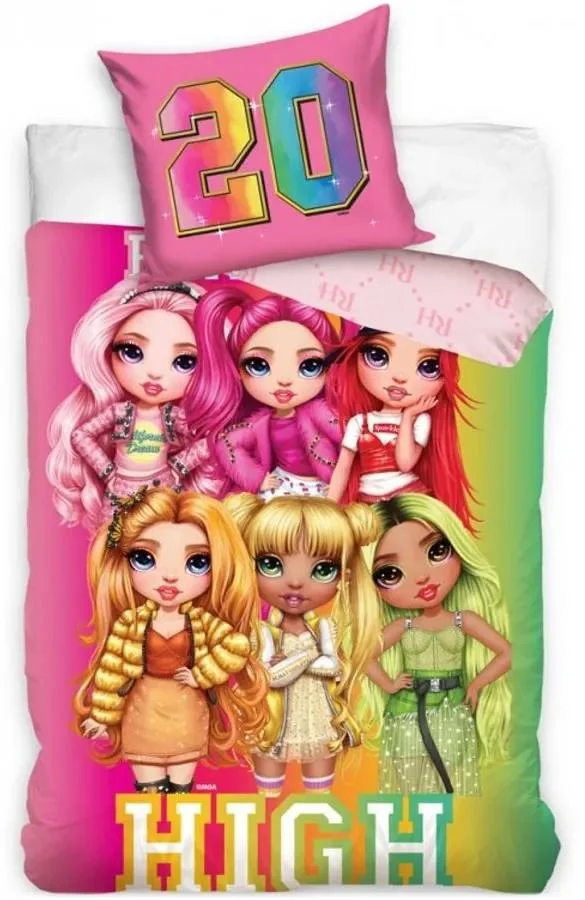 Přineste do dětského pokoje veselou atmosféru s touto oboustrannou sadou ložního povlečení Rainbow High, vyrobenou ze 100% kvalitní bavlny. Povlečení je ozvláštněno motivem panenek Rainbow High s výraznými barevnými vlasy a stylovými outfity na jedné straně, zatímco druhá strana je v růžové barvě s nápisem RH.