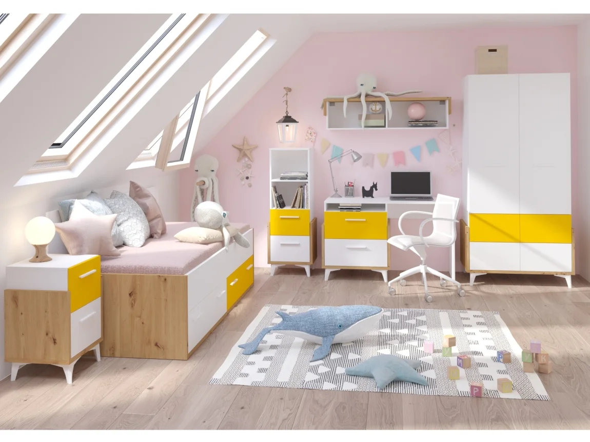 Objevte modulární systém LEPON 1 pro dětský pokoj ve stylu dub artisan / bílá / žlutá. Tento koncept je představen jako jedna z možných sestav, avšak jednotlivé díly lze pořídit samostatně, takže si snadno vytvoříte prostor podle vlídných potřeb dítěte. Příkladem je kompletní výbava zahrnující noční stolek, postel s laťovým roštem o rozměrech 90×200 cm, regál, police, psací stůl a šatní skříň; v ceně postele je rošt, matrace není součástí a doporučujeme matraci 90×200 cm. Rozměry jednotlivých prvků jsou orientační: noční stolek cca 45×67×42 cm, regál cca 45×127×42 cm, police 125×31×27 cm, psací stůl 125×76×57 cm a skříň 95×195×62 cm. Univerzální police lze pověsit nahoru i dolů podle potřeby.