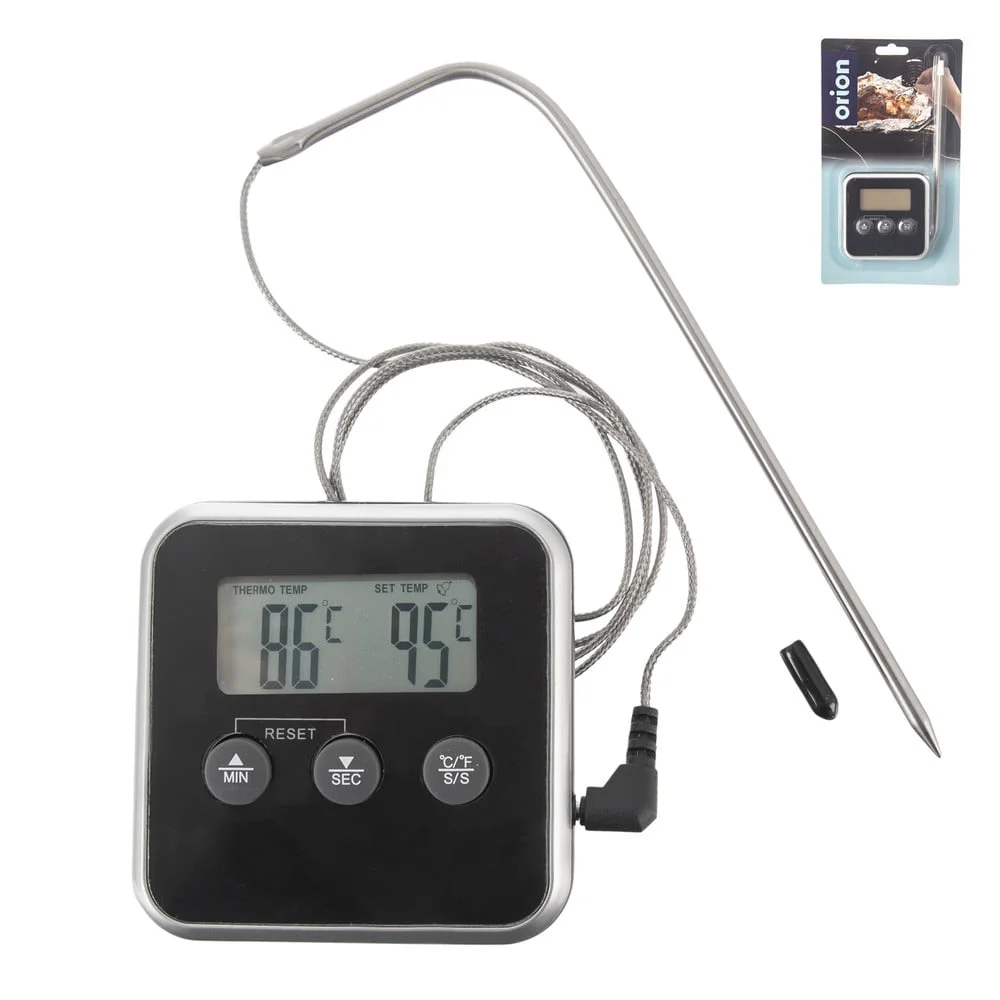 Zařízení od značky Orion kombinuje přesné měření teploty s funkcí minutky, což vám umožní snadnou kontrolu při přípravě pokrmů. Díky sondě dlouhé 16 cm získáte ideální přehled o teplotě masa, ale využijete ho také při vaření džemů, karamelu nebo při chlazení potravin. Na přehledné digitální obrazovce můžete sledovat aktuální teplotu v rozmezí od -20 °C do 300 °C, což zaručuje široké využití v kuchyni.