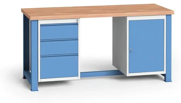 Moderní dílenský stůl KOVONA nabízí robustní pracovní plochu vyrobenou z kvalitní bukové spárovky o tloušťce 40 mm, která zajišťuje pevnost a odolnost i při náročném využití. Stabilní konstrukce je postavena na pevných ocelových nohách, svařených z 3mm profilů a lakovaných práškovým lakem, což zaručuje dlouhou životnost a odolnost vůči opotřebení. Výška stolu je ideální pro pohodlnou práci, přičemž je možné jej dodat ve třech délkách – 1200, 1700 nebo 2100 mm – podle vašich potřeb. Součástí balení jsou praktické úložné prostory: závěsná skříňka a tři zásuvky s nosností 40 kg, které jsou usazeny v kvalitních kuličkových pojezdech s 90% výsuvem, což umožňuje snadný přístup k uloženému nářadí. Zásuvky jsou uzamykatelné centrálním cylindrickým zámkem, což zvyšuje bezpečnost vašich cenností. Povrchová úprava v šedé a modré barvě nejenže vypadá moderně, ale také chrání před poškozením. Tento pracovní stůl je ideální volbou pro profesionální dílny i domácí kutily, kteří hledají spolehlivost, organizaci a dlouhodobou odolnost.