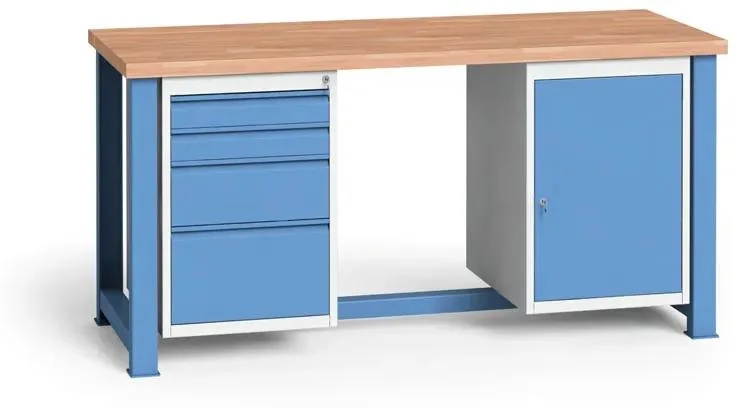Pracovní plocha tohoto dílenského stolu je vyrobena z odolné bukové spárovky o tloušťce 40 mm, což zaručuje pevnost a dlouhou životnost. Stabilní konstrukce je dosažena díky pevným nohou z ocelových profilů o tloušťce 3 mm, které jsou lakované práškovým lakem a zajišťují výbornou stabilitu i při náročnějších úkolech. Výška pracovního stolu je nastavena na 840 mm, což umožňuje pohodlnou práci ve stojící i sedící poloze. Tento model je dostupný ve třech délkách – 1200, 1700 a 2100 mm, takže si ho můžete přizpůsobit podle svých potřeb. Integrované úložné prostory tvoří pevné kovové zásuvky s nosností 40 kg, které jsou vybaveny kvalitními kuličkovými pojezdy s 90% výsuvem, a jsou zabezpečené centrálním zámkem se dvěma klíči. Díky povrchové úpravě práškovým lakem v moderní šedé barvě rámu a modrým zásuvkám v odstínu RAL 5012 je stůl nejen funkční, ale i vizuálně atraktivní. Tento dílenský stůl je ideální volbou pro profesionální dílny i domácí kutily, kteří ocení pevnost, praktičnost a dobře promyšlené uspořádání prostoru.