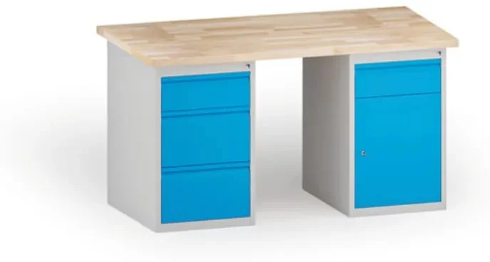 Moderní dílenský stůl o délce 1500 mm je vybaven pevným a odolným pracovním povrchem vyrobeným z masivní bukové spárovky, která má sílu 40 mm. Díky své váze a stabilní konstrukci se může pochlubit výjimečnou pevností, ideální i pro náročné pracovní úkoly. Integrované zásuvky a skříňky s výškou 800 mm jsou pevně připevněny přímo ke spodní straně desky, což zajišťuje stabilitu a funkčnost. Zásuvky s nosností až 40 kg jsou vybaveny kvalitními kuličkovými pojezdy s téměř 100% výsuvem, a jsou opatřeny centrálním zamykáním, které chrání vaše nářadí. Povrchová úprava v elegantní šedé barvě RAL 7035 a modrých zásuvkách RAL 5012 nejenže zvyšují odolnost, ale také dodávají stylový vzhled. Tento pracovní stůl je ideální volbou pro profesionální dílny i domácí kutily, kteří ocení kombinaci odolnosti, bezpečí a moderního designu.