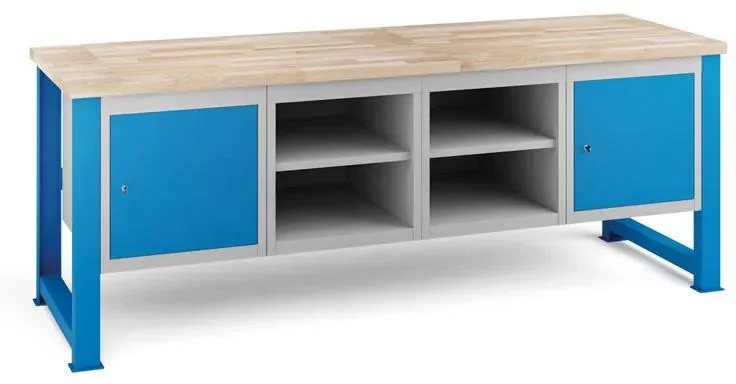 Stabilní ocelové nohy, svařené z profilů o tloušťce 3 mm a lakované v moderním odstínu RAL 5012, poskytují pevnou oporu. Tento model je dostupný ve třech délkách: 1200, 1700 a 2100 mm, což umožňuje přizpůsobení podle potřeb vaší dílny. Praktické úložné prostory tvoří čtyři závěsné skříňky na nářadí a odolné zásuvky s nosností až 40 kg, které jsou vybavené výsuvnými pojezdy s kuličkovými ložisky pro snadný přístup. Zásuvky jsou uzamykatelné centrálním zámkem a mají modré provedení v odstínu RAL 5012, zatímco rám je šedé barvy RAL 7035. Tento dílenský stůl je ideální volbou pro každého, kdo hledá kombinaci pevnosti, funkčnosti a přehledného uložiště nářadí. Doporučujeme ho pro profesionální dílny i domácí kutily, kteří ocení kvalitní zpracování a praktické uspořádání.