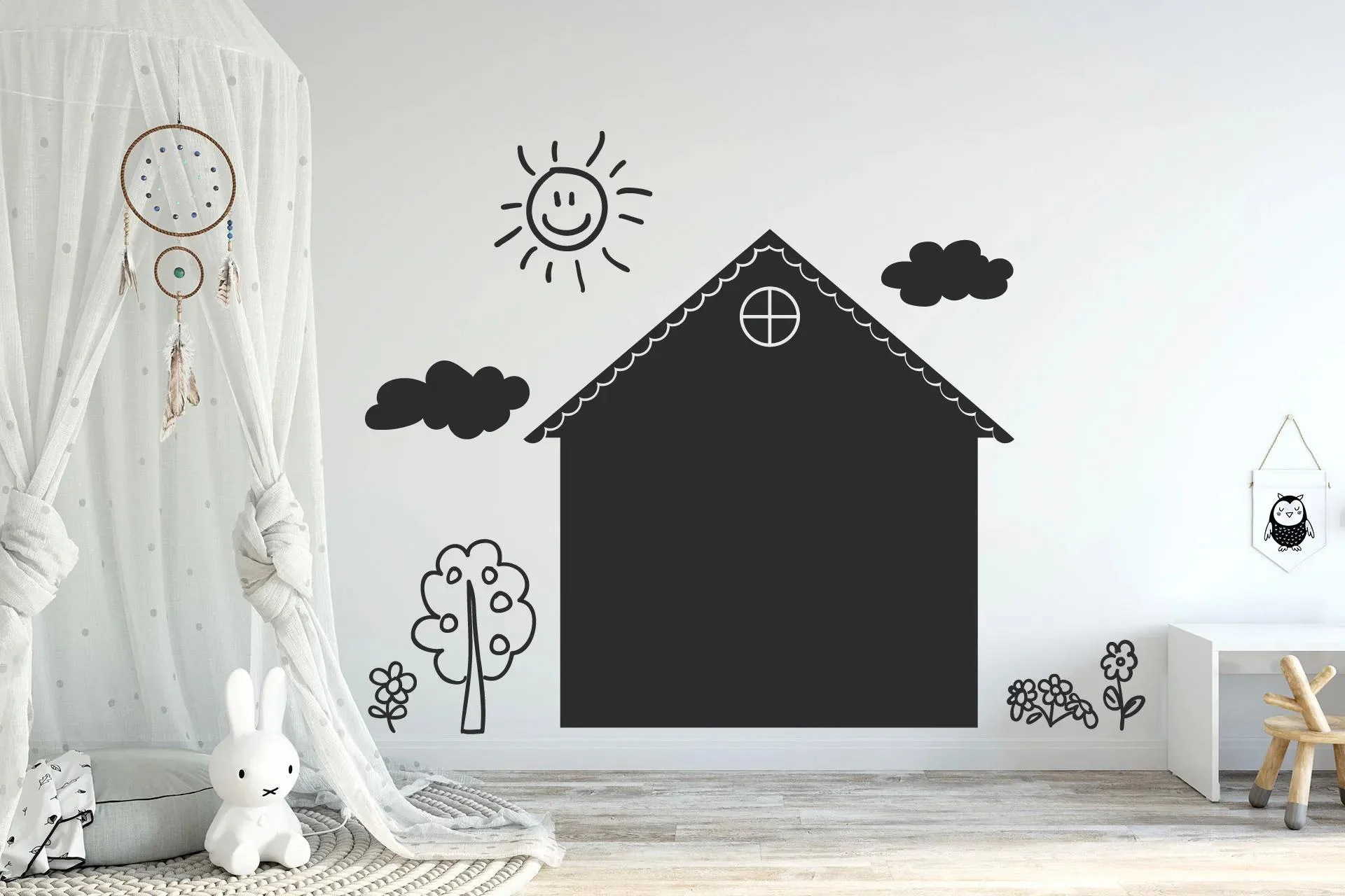 Stylová samolepící tabule ve tvaru domečku o rozměrech 90x90 cm, navržena pro kreativní využití na stěnách či jiných hladkých površích. Vyrobena z kvalitní ekologické fólie s matným povrchem, která zajišťuje krásný vzhled a viditelnost ze všech úhlů.