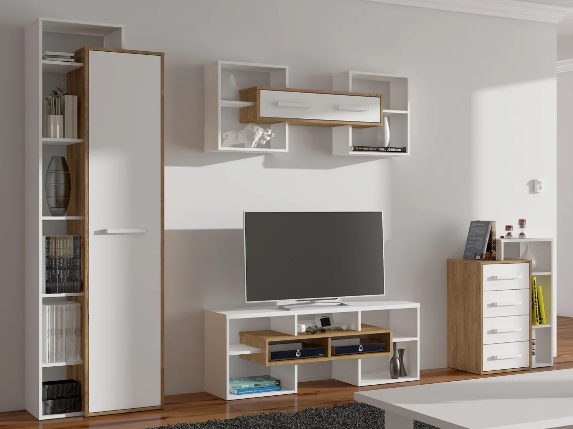 Set Dorinda 2 pro obývací pokoj kombinuje dub burgundský s bílou, čímž vytváří moderní kontrast vhodný do různých interiérů. Jedná se o modulární systém, který umožňuje pořídit a uspořádat jednotlivé komponenty samostatně a poskládat si vlastní konfiguraci podle potřeby. V ukázkové sestavě jsou zahrnuty: skříň 64 x 203 x 41 cm, komoda 64 x 86 x 41 cm, police s výklopem 127 x 50 x 29 cm a TV stolek 127 x 48 x 38 cm. Celá sada je provedena z LTD s ABS hranami a vybavena tiché zavírání, které zvyšuje pohodlí provozu. Dodáváno v demontu a se zárukou 5 let. Tato kombinace řeší praktické ukládání a díky čistým liniím působí nadčasově, takže ji lze snadno sladit s různými doplňky a barvami.