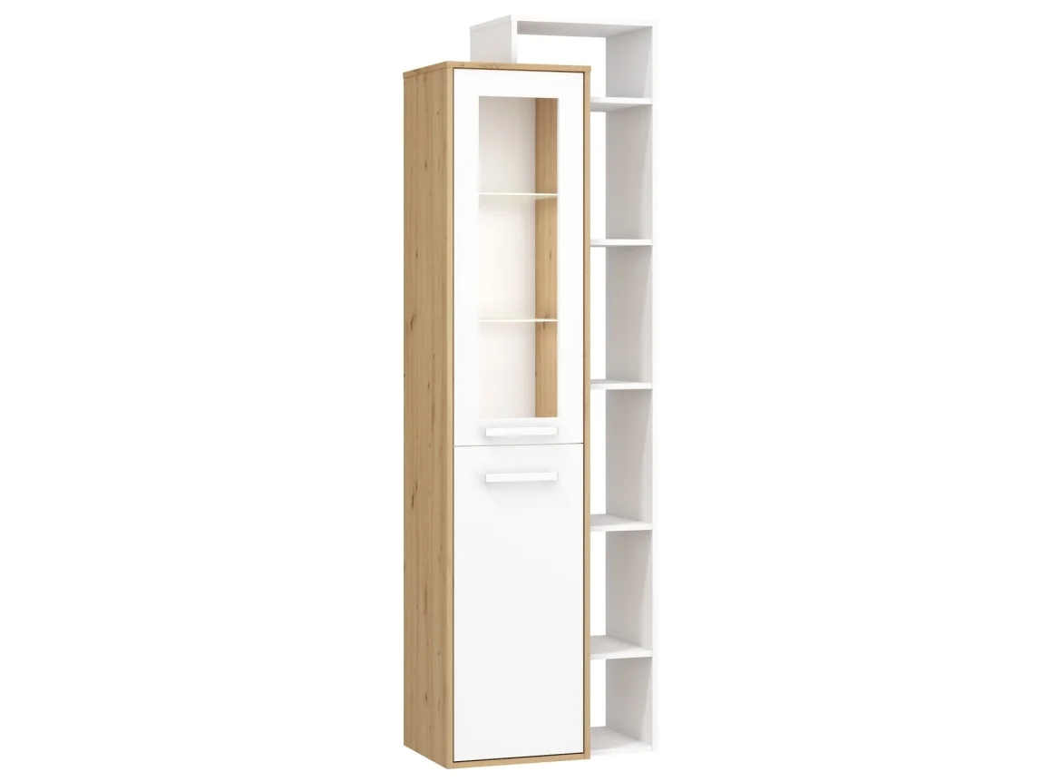 Vitrína Dorinda typ 1 kombinuje dub artisan s bílým dekorem a je dodávána v pravém provedení o rozměrech 64 × 203 × 41 cm. Je vyrobená z LTD desek s ABS hranami a skleněnými plochami, které dodávají interiéru luxusní a svěží vzhled.