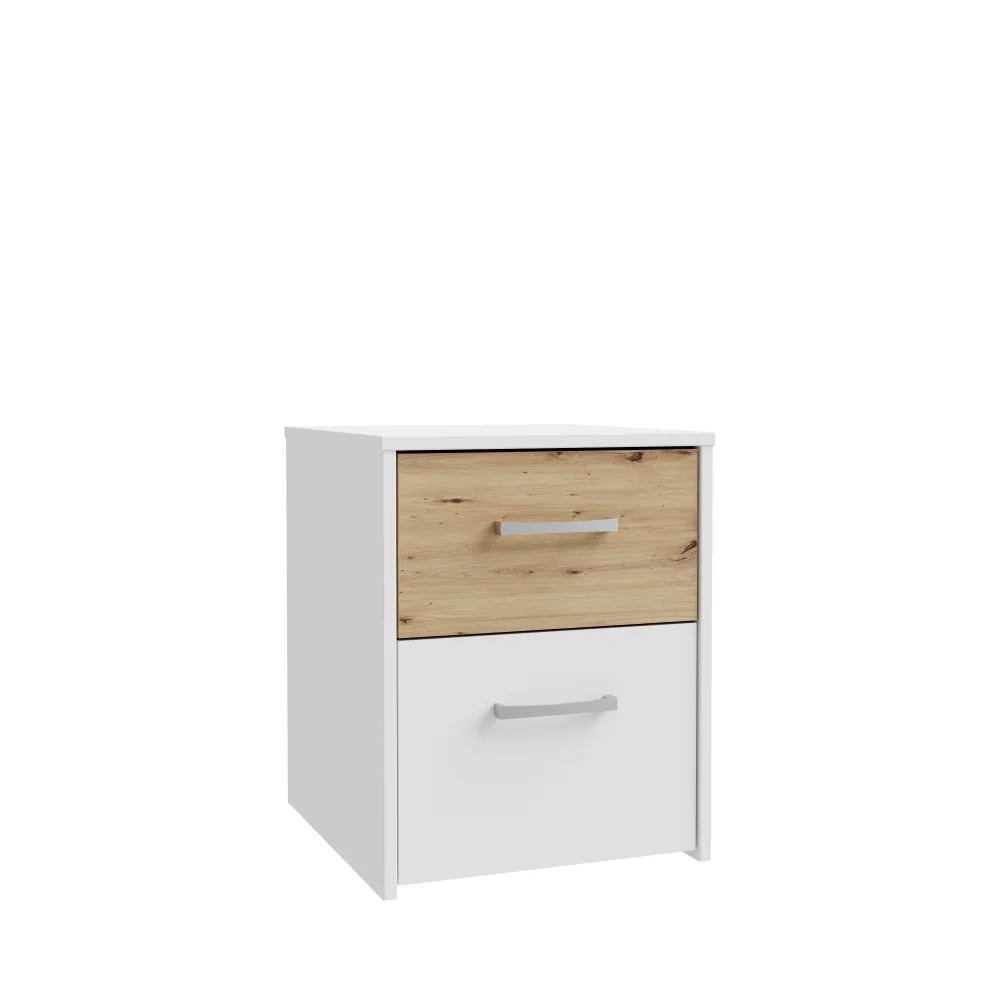 Rozměry nočního stolku (šířka x výška x hloubka): 38,4 x 48,1 x 41,5 cm. Kostra je z lamina tloušťky 15/22 mm, což zajistí pevnost a dlouhou životnost. Elegantní lamino konstrukce v kombinaci bílé barvy a dekoru dub artisan vytváří moderní vzhled.