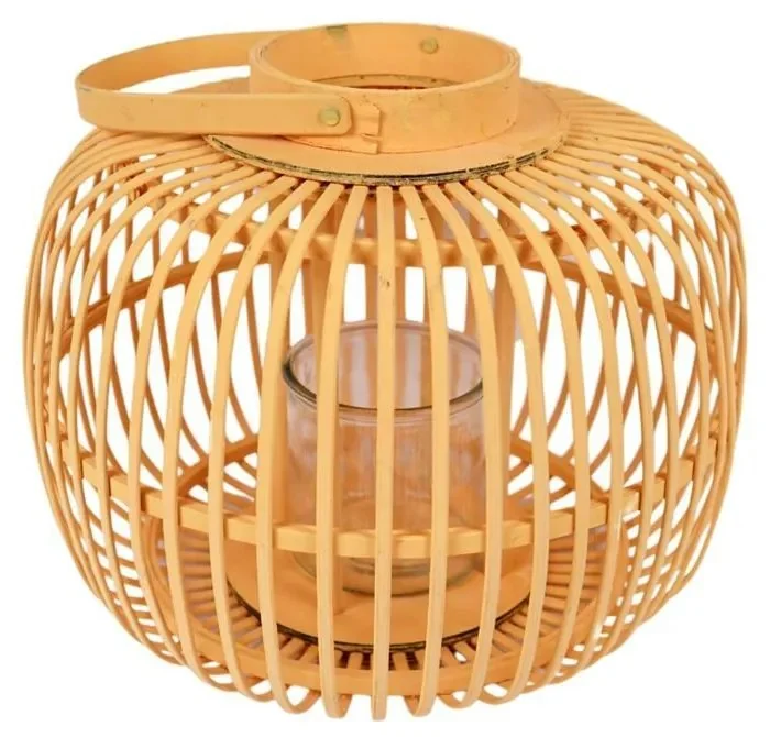 Stylová oranžová lucerna vyrobená z kvalitního dřeva a skla, ideální pro vytvoření útulné atmosféry. S průměrem 39 cm a výškou 28 cm je vhodná jak k zavěšení, tak i k postavení na rovný povrch.