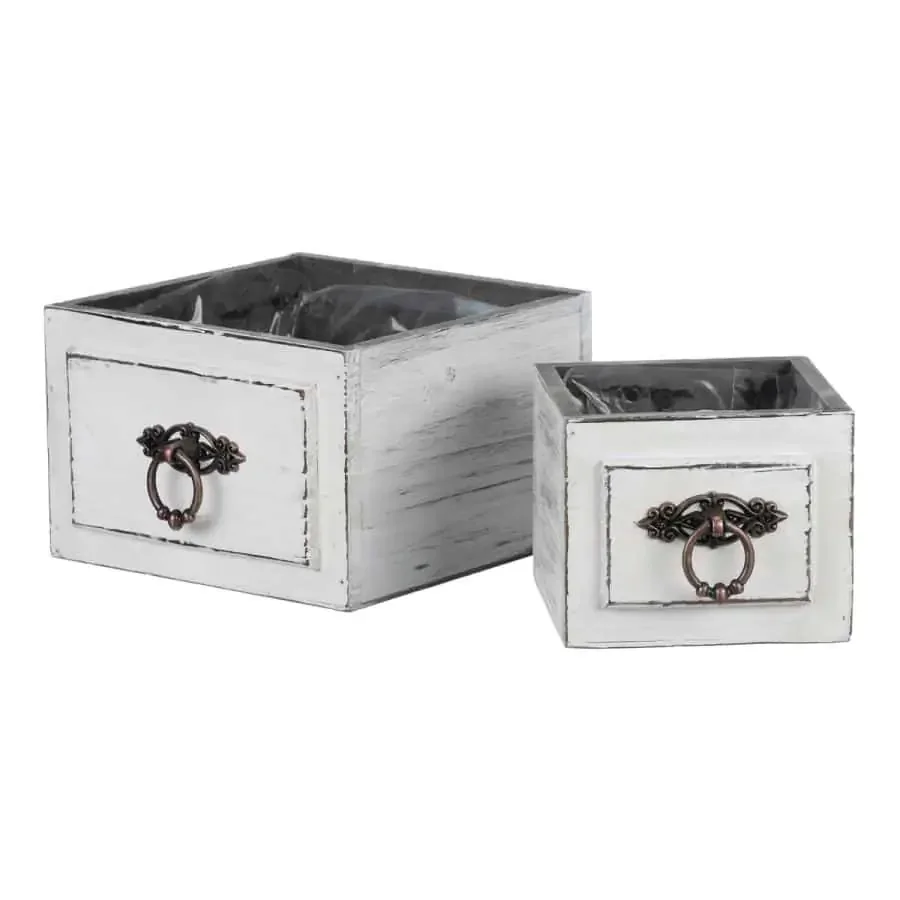 Vytvořte do svého prostoru retro atmosféru díky přírodním materiálům a jemné patině. Sada AB2195 nabízí dva šuplíkové obaly ze dřeva, které lze využít pro květiny, bylinky i drobnosti.