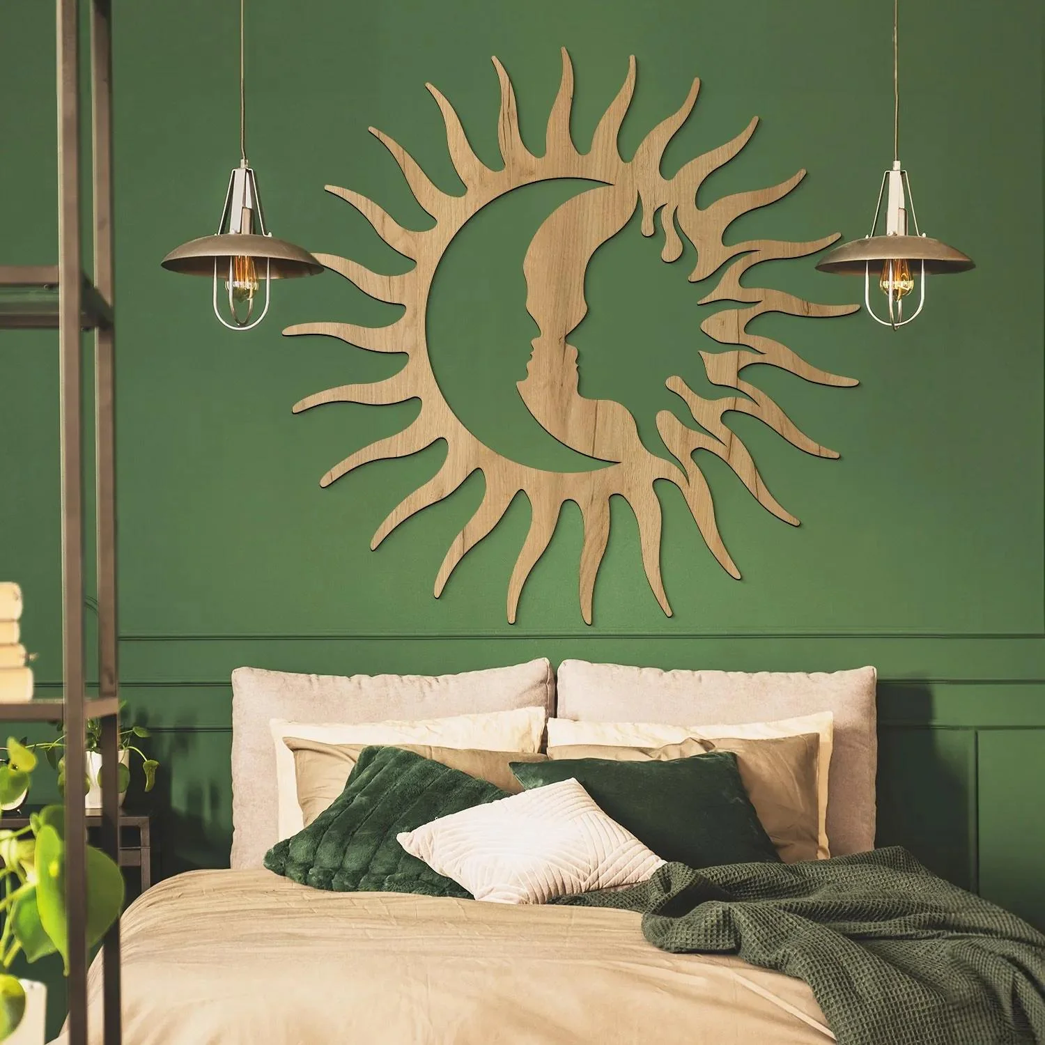 Oživte svou ložnici jedinečným dřevěným obrazem s motivem Noc a Den, který harmonicky spojuje symboliku slunce a měsíce. Ideální nad postel nebo do klidných koutů, tento originální dekor přinese do vašeho prostoru pocit pohody a elegance.