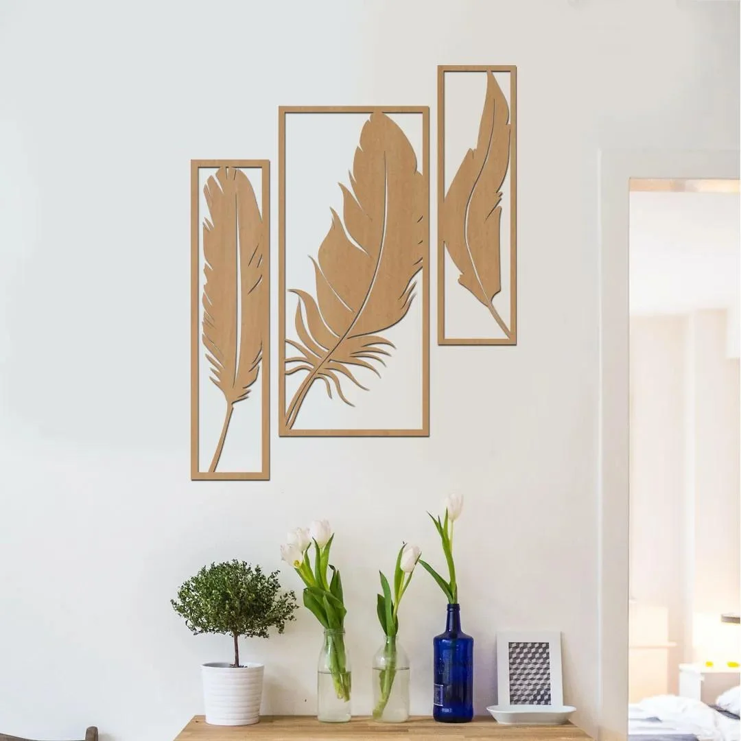 Elegantní třídílný dřevěný dekorativní panel s motivem peříček přinese do vašeho domova jemnost a přírodní atmosféru. Vyřezávané motivy z odolného HDF materiálu umožňují bohaté detaily a dlouhou životnost.