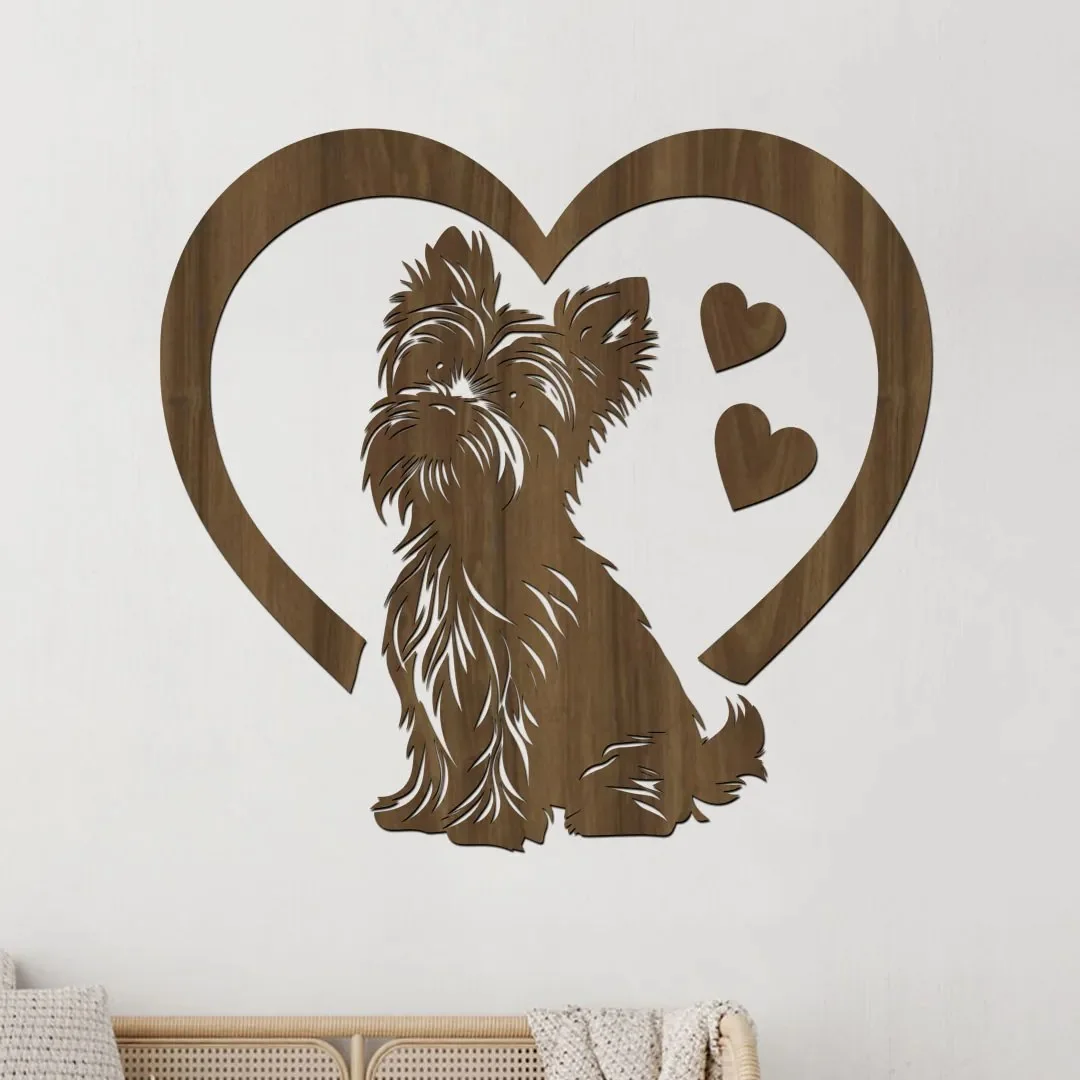 Elegantní dřevěný portrét oblíbeného plemene Biewer Teriér, zachycený uprostřed srdce, je skvělým doplňkem každého interiéru. Vyroben z kvalitního dřeva s důrazem na detail, tento rustikální obraz přináší do vašeho domova nádech přírody a lásky ke psům.