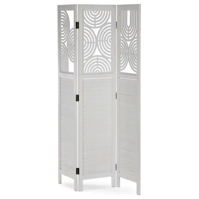 Naprosto účelný třípanelový paraván EF-L175 WT z masivního smrkového dřeva v bílé povrchové úpravě dodá interiéru svěží a lehký vzhled. Horní část dílů je ozdobně vyřezána, takže propouští světlo a zároveň chrání soukromí.