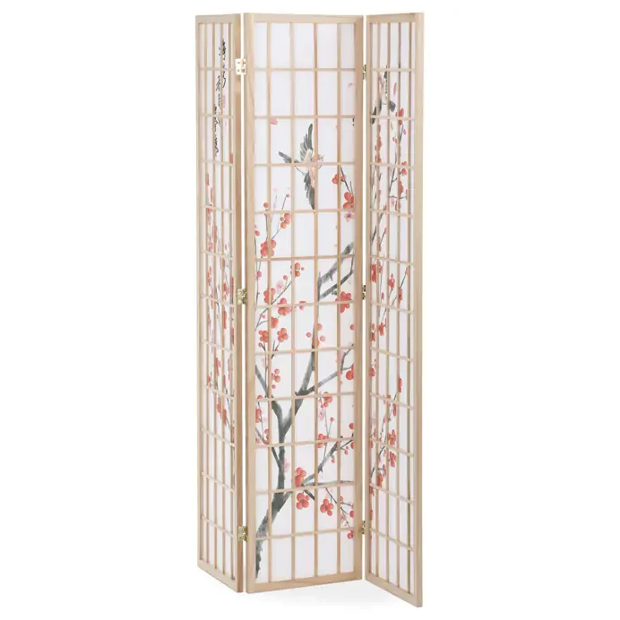 Třípanelový paraván EF-L185 NAT je vyroben z masivního smrkového dřeva v přírodním odstínu a vytváří lehkou, vzdušnou přepážku s bílou netkanou textilií, kterou zdobí jemný motiv větviček s květy a ptáky v černé a červené. Pevné dřevěné rámy zajišťují stabilitu a zároveň umožňují rychlé složení a snadné přemístění. Paraván je vhodný pro optické oddělení prostoru v interiéru; díky přírodní barevnosti a decentnímu dekoru navozuje uklidňující atmosféru. Lehký materiál se snadno udržuje a je ideální do obývacích pokojů, ložnic či kanceláří. S balením se paraván dodává v kartonové krabici o rozměrech 172,5 x 44 x 8 cm.