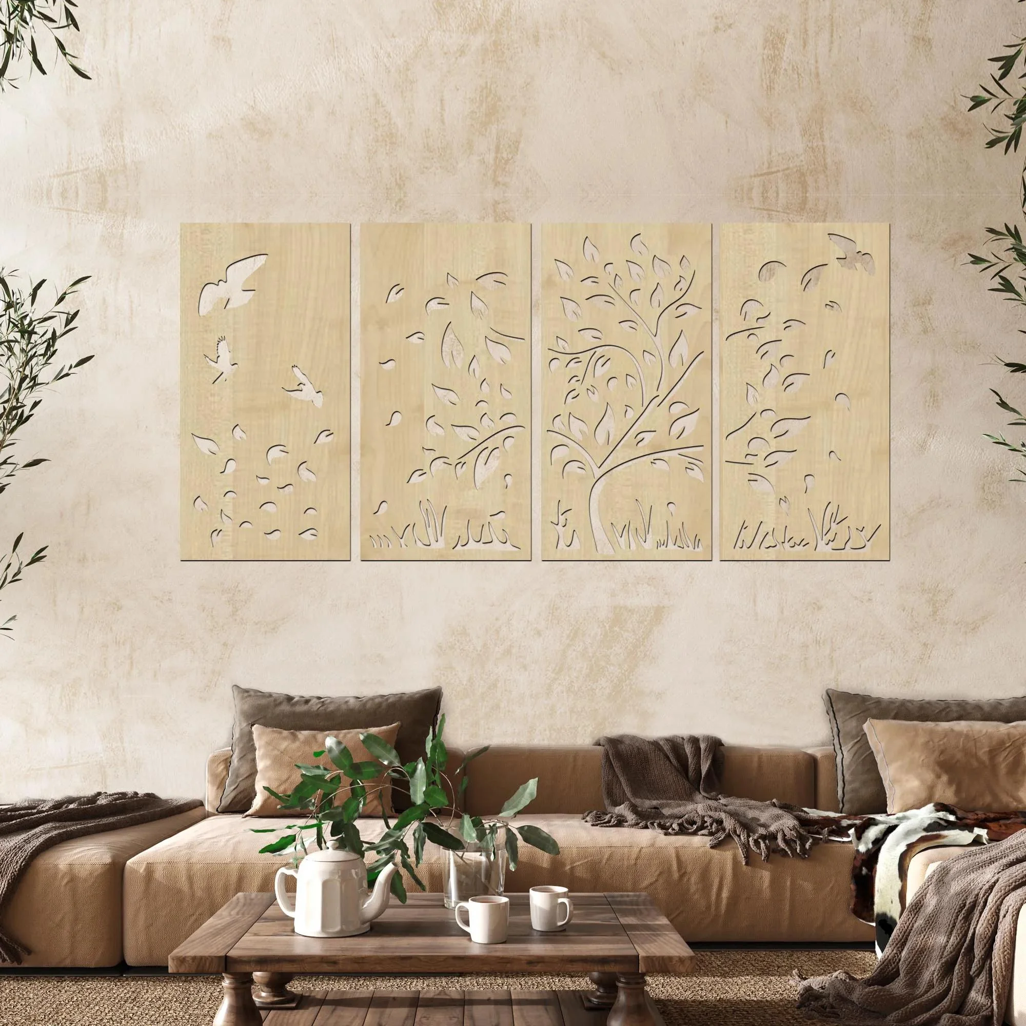 Elegantní čtyřdílná dekorace ve tvaru podzimního stromu s padajícími listy přináší do vašeho interiéru kouzlo podzimu a přírodního cyklu života. Tento originální kus z vysoce kvalitního českého HDF zachycuje jemnost a sílu proměny ročního období, a jeho variabilní rozložení umožňuje kreativní uspořádání na stěně.