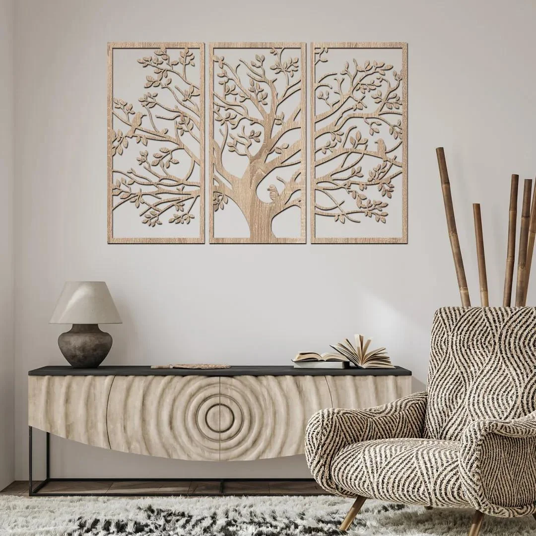 Vytvořte si jedinečnou atmosféru ve vašem domově s naším 3dílným dřevěným stromem zdobeným ptáky, který symbolizuje propojení mezi zemí a nebem, moudrost a stabilitu. Tento elegantní obraz je ideální pro obývací pokoj, vstupní halu nebo ložnici.