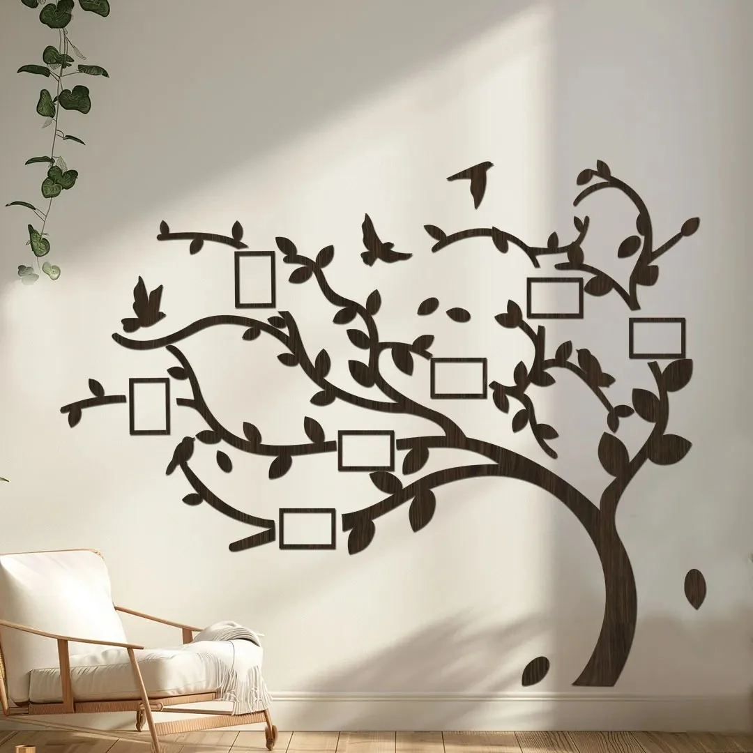 Oživte svůj interiér přírodním motivem s elegantním dřevěným stromem zdobeným ptáčky a listy. Tento unikátní dekorativní panel, vyrobený z kvalitního HDF materiálu, nabízí možnost výměny fotografií díky praktickým fotorámečkům na zavěšení.