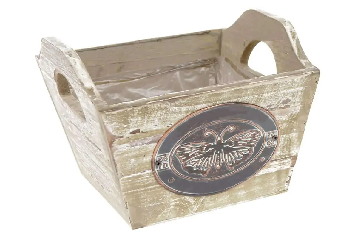 Pro aranžování květin je tento dřevěný truhlík s plastovou vložkou ideální volbou v přírodní barvě. Praktická vložka uvnitř usnadňuje údržbu a umožňuje rychlou výměnu substrátu či vody. Nechybí jemný dekorativní motýlek, který dodává produktu romantický šmrnc. Díky pevné konstrukci se hodí na okenní parapet, stůl či polici a vytvoří ve vašem interiéru či zahradě přírodní, stylový vzhled.