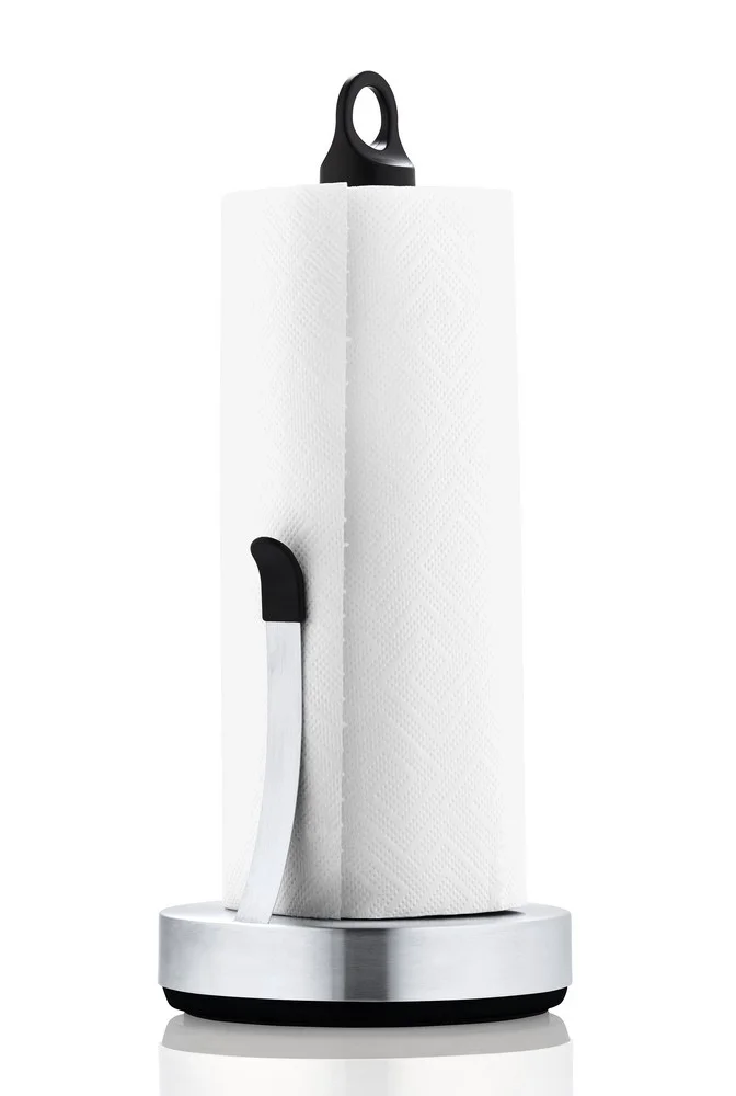 Držák LOOP na papírové utěrky spojuje elegantní vzhled s promyšlenou praktičností. Je vyroben z nerezové oceli a plastu, spodní pogumovaná část zabraňuje pohybu a poškození povrchu. Tento držák je skutečně stabilní a utěrky lze trhat jednou rukou. Díky postrannímu klipu se role nerozmotává a utěrky zůstávají vždy po ruce. S tímto doplňkem budete mít papírové utěrky snadno k dispozici v kuchyni i při stolování. Stabilní design zajišťuje bezpečné používání, snadnou údržbu a dlouhou životnost. Rozměry: výška 34 cm, průměr 15 cm. Návrhář: Flöz Design.