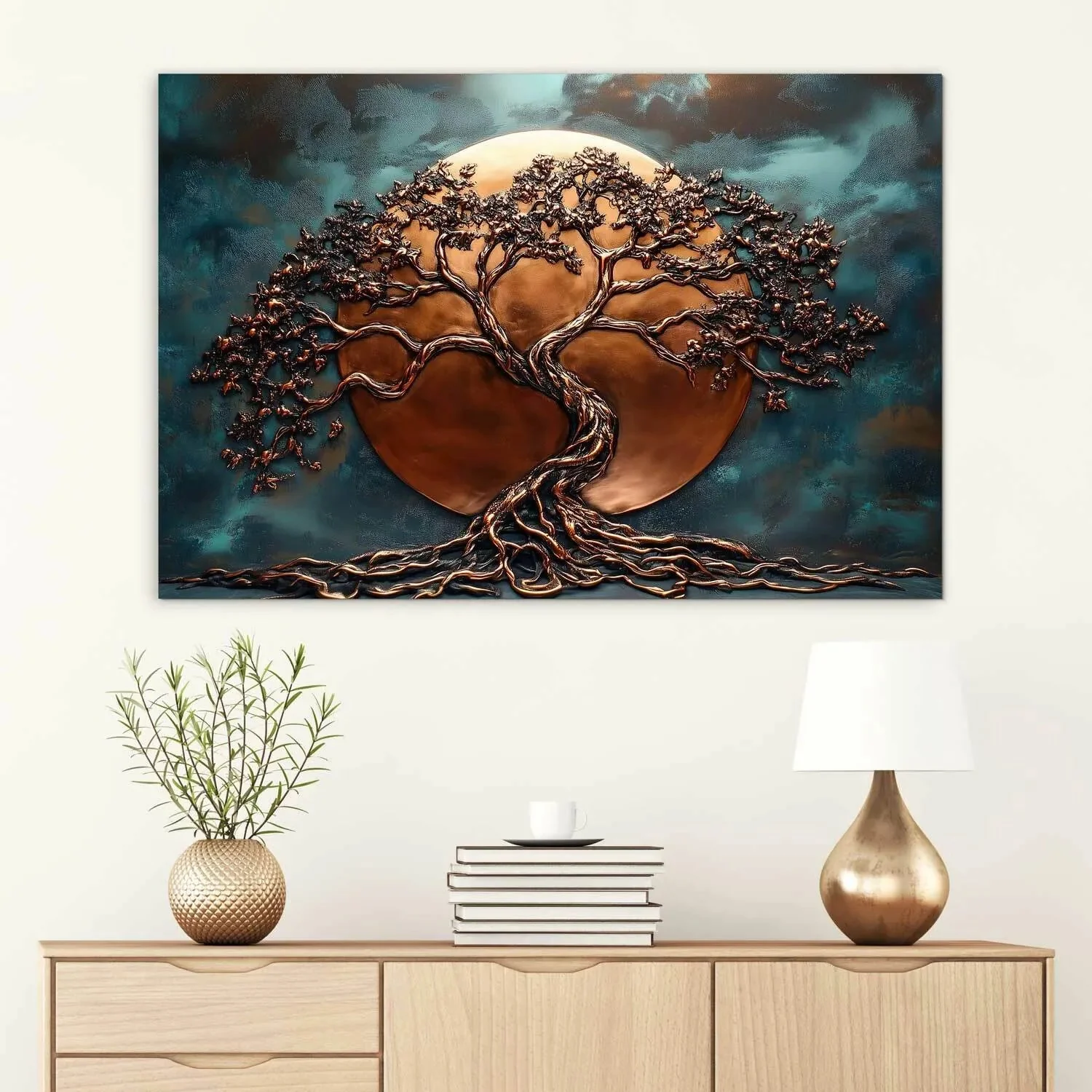 Obraz z kvalitního dřeva, který spojuje symboliku věčného stromu života s mystickou lunou, představuje stylové a významné dekorativní dílo do vašeho interiéru. Díky preciznímu zpracování a 3D efektu kořenů a větví působí dojmem měděného reliéfu, zatímco teplé bronzové tóny a smaragdové pozadí vytvářejí jedinečný vizuální zážitek.