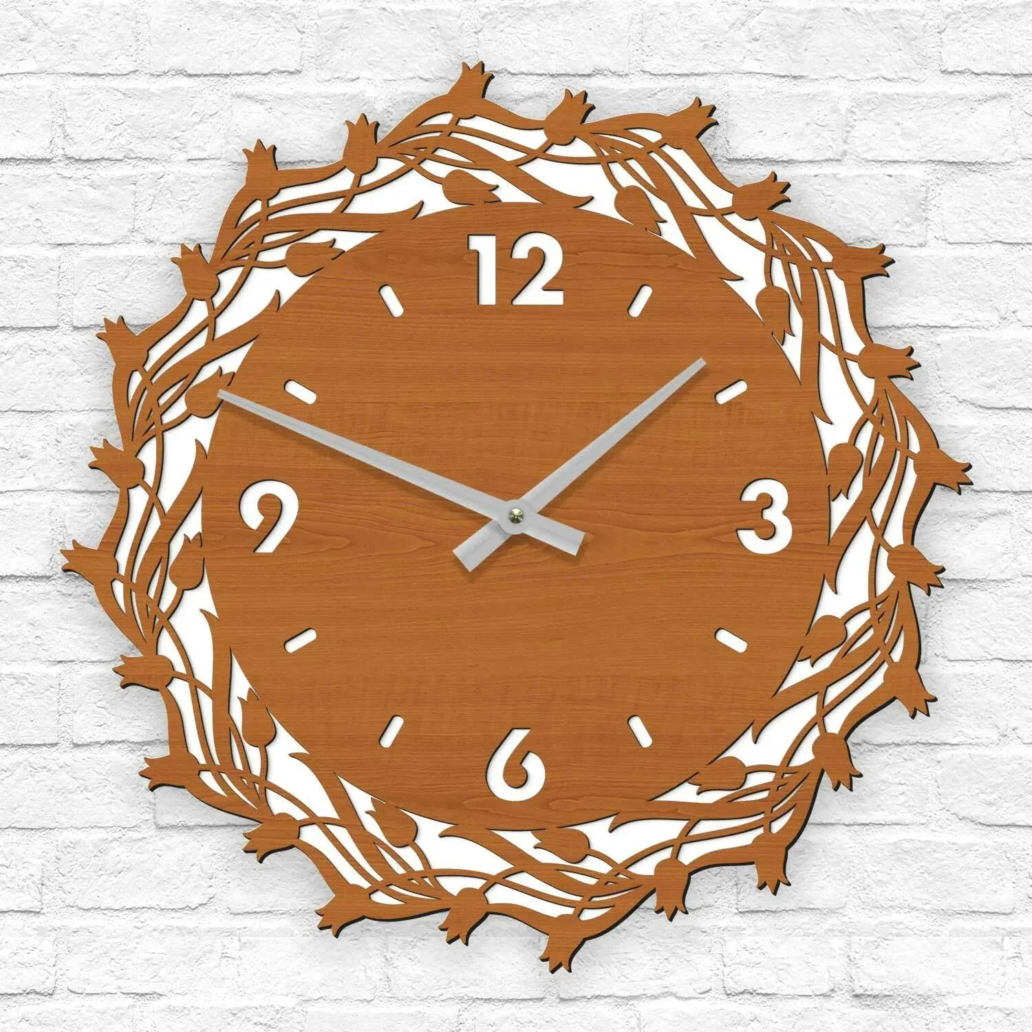 Elegantní a funkční dřevěné hodiny v minimalistickém designu s motivem tulipánů představují ideální dekoraci pro váš obývací pokoj nebo kuchyň. Jejich jednoduchý, přesto stylový vzhled dokonale sladí interiér a zároveň poslouží jako výrazný designový prvek.