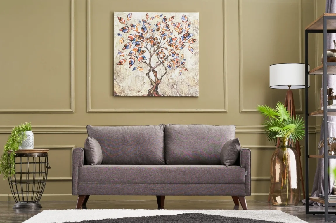 Dvojsedák AMARA v hnědé barvě spojuje pevný rám z dřevotřísky a MDF s odolným potahem z 100% polyesteru. Celkové rozměry: šířka 177 cm, výška 85 cm a hloubka 81 cm; sedací hloubka 53 cm a výška sedáku 43 cm.