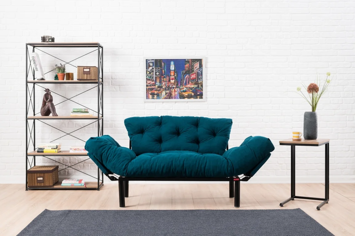 Lůžko po rozložení poskytuje plochu 190 x 70 cm pro komfortní spaní. Výplň z vysokokvalitní pěny zajišťuje optimální podpěru a pohodlí. Nohy jsou plastové, výška 25 cm, což podporuje stabilitu a vzdušný dojem prostoru. Maximální nosnost až 200 kg. Barva čalounění je petrolejově modrá. Dodáváno v demontu. Snadno se čistí a hodí se do moderních i tradičních interiérů.