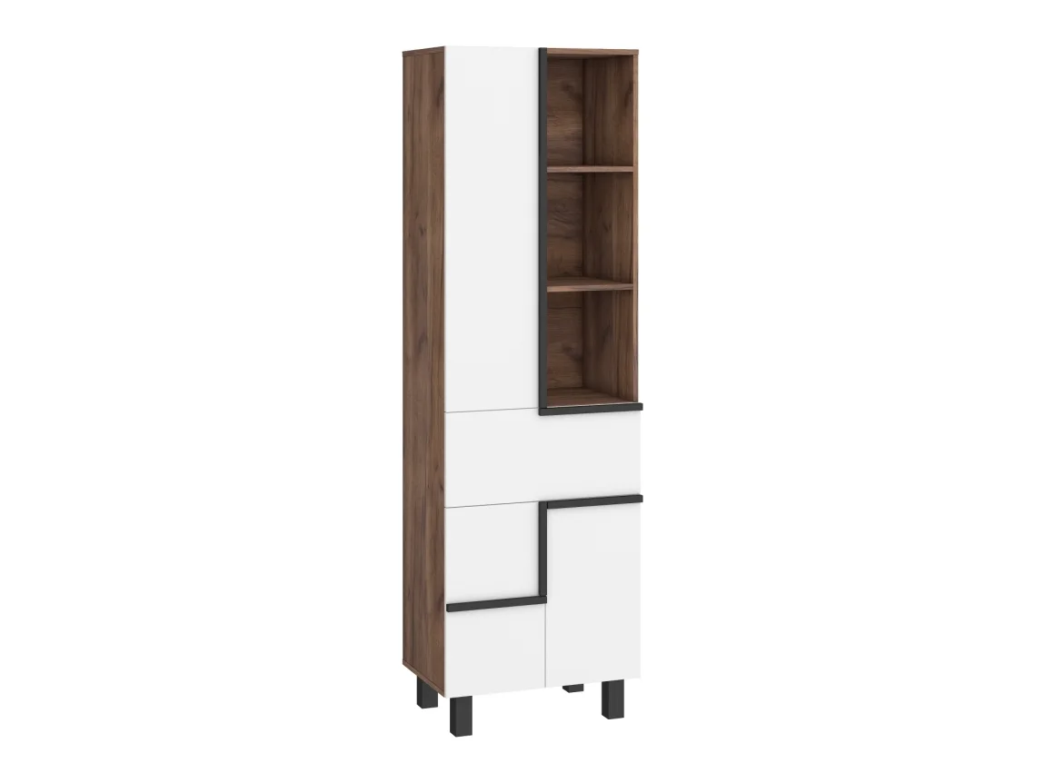 tichý dovírací systém zajišťuje tiché a plynulé dovírání dveří i zásuvek. Barva kombinuje craft tobaco a bílou s černými lištami a nožkami pro moderní vzhled. Rozměry 60 x 195 x 42 cm; výška nožek 12 cm. Materiál tvoří 16 mm lamino s ABS hranami a dřevěné nohy, což zaručuje pevnost a snadnou údržbu. Dodáváno v demontu; záruka 5 let. Díky neutrálnímu barevnému provedení se regál hodí do různých interiérů a příjemně doplní obývací i pracovnu. Výška nožek usnadňuje úklid pod nábytkem a zlepšuje cirkulaci vzduchu pod nábytkem.